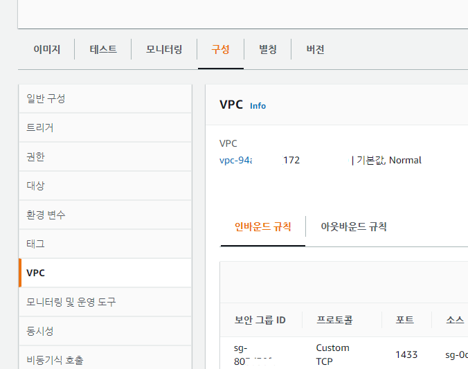 만약 AWS 내에 RDS(데이터베이스)까지 있는 상황이라면 VPC 보안 그룹에 해당 Lambda가 포함 되어 있어야 되며 이러한 작업을 하지 않았다면 정작 올려놓은 서비스가 데이터베이스에 접근하지 못해 오류를 내 뱉을 것이다.